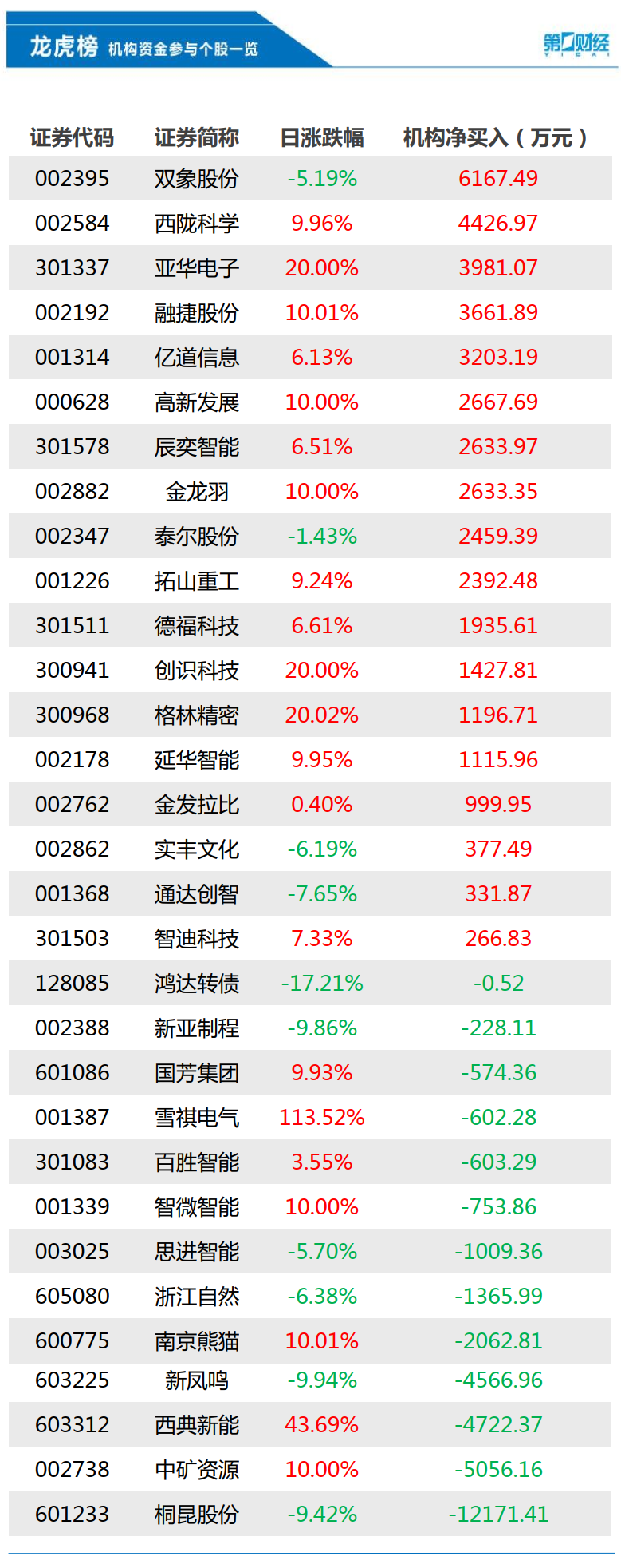 当天机构净买入前三的股票分别是双象股份、西陇科学、亚华电子,净买入金额分别是6167万元、4427万元、3981万元。