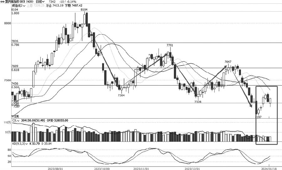 从聚丙烯加权日线走势图可以看出,该品种自去年9月19日见顶8104元/吨以来,出现报复性回落,随后出现为期4个月的大幅波动、振荡走低态势。近期见底7197元/吨后,展开反弹并靠近均线系统,KD指标也金叉向上,但是在反弹过程中大幅减仓、成交量也有所萎缩,说明有资金出逃的嫌疑。况且目前均线系统空头排列,反弹幅度也有限。故此推断,目前的反弹也仅仅是弱势反弹,不具备转势的动能和结构。(中辉期货李卫东)