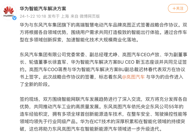 企业方发布的照片显示,东风汽车集团有限公司党委常委、副总经理尤峥,岚图汽车CEO卢放,华为副董事长、轮值董事长徐直军,华为智能汽车解决方案BU CEO靳玉志参加了签约活动。华为常务董事、终端BG CEO、智能汽车解决方案BU董事长余承东并未出现在签约活动现场。